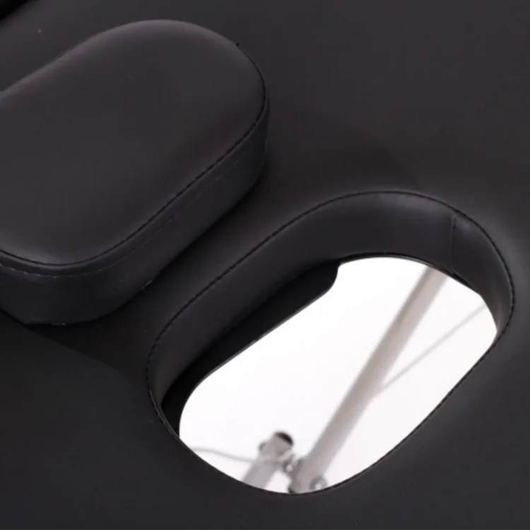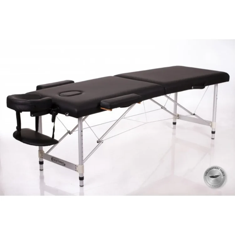 Lichte en draagbare aluminium massagetafel met verstelbare hoogte en comfortabele accessoires in zwart.