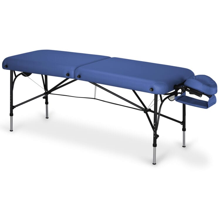 Stabiele en veelzijdige tweepoots massagetafel met Vinyl Flex bekleding en ergonomische features voor professioneel gebruik.